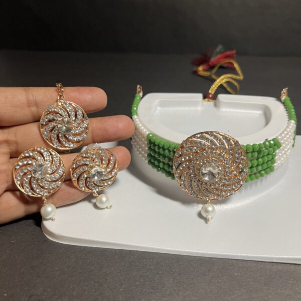 Elegant handcrafted choker set with matching earrings and maang tikka, featuring swirl design and pearl drop. Available in 3 stunning colors β perfect for ethnic and festive wear.