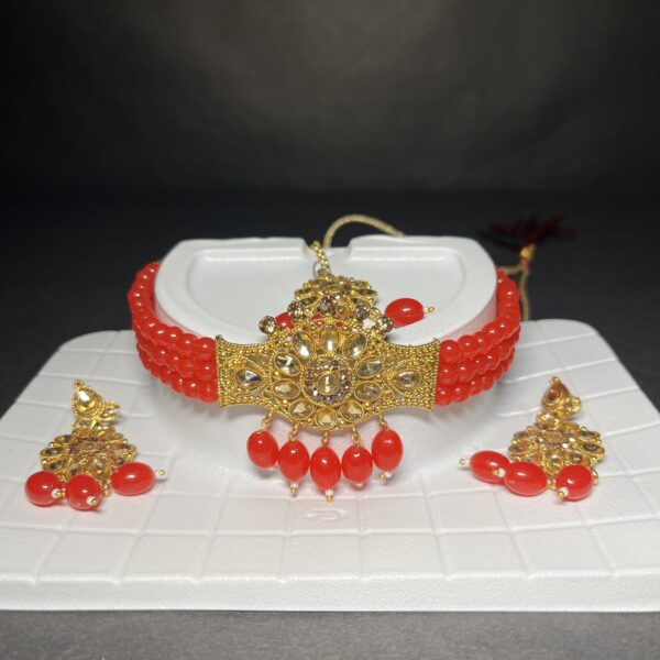 Luxurious imitation bridal choker set with stone-studded finish and matching earrings & maang tikka. Available in 3 stunning color options β Gold, Red, and Green.