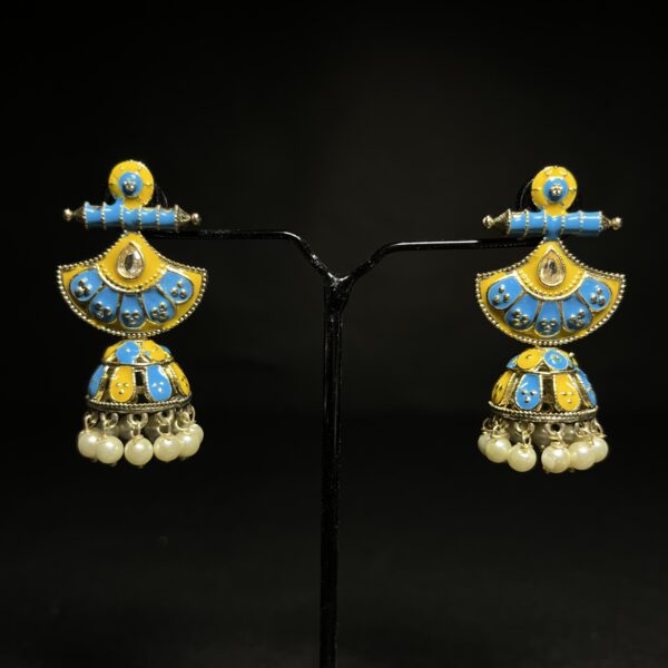 Bright color fusion meenakari jhumka earrings with classic pearl danglings β traditional design with a trendy twist. Available in 4 stylish color combinations.