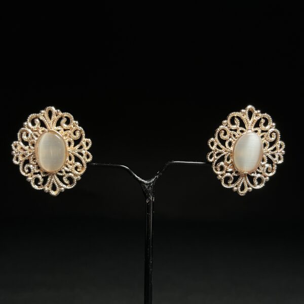 Elegant antique gold oval stud earrings with intricate filigree border and classic center stone β a timeless ethnic piece.