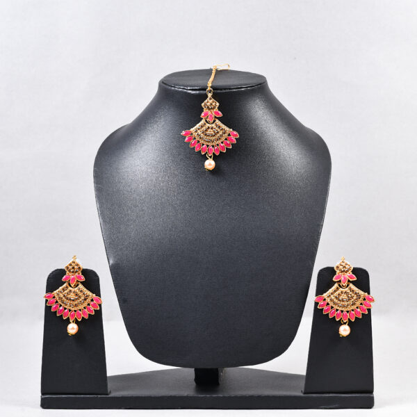 Elegant chandbali earrings with a matching maang tikka, featuring enamel detailing and pearl hangings on a golden antique base β perfect for weddings & festive looks.