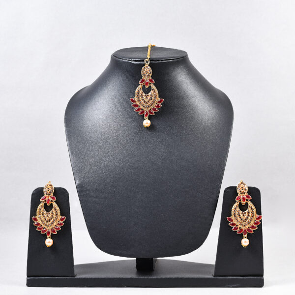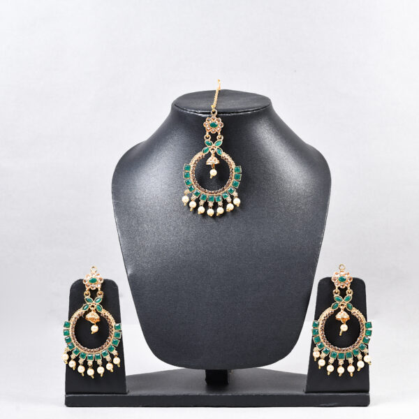 A delicate drop-shaped earring and maang tikka set with vibrant pearl detailing, perfect for festive and traditional occasions.