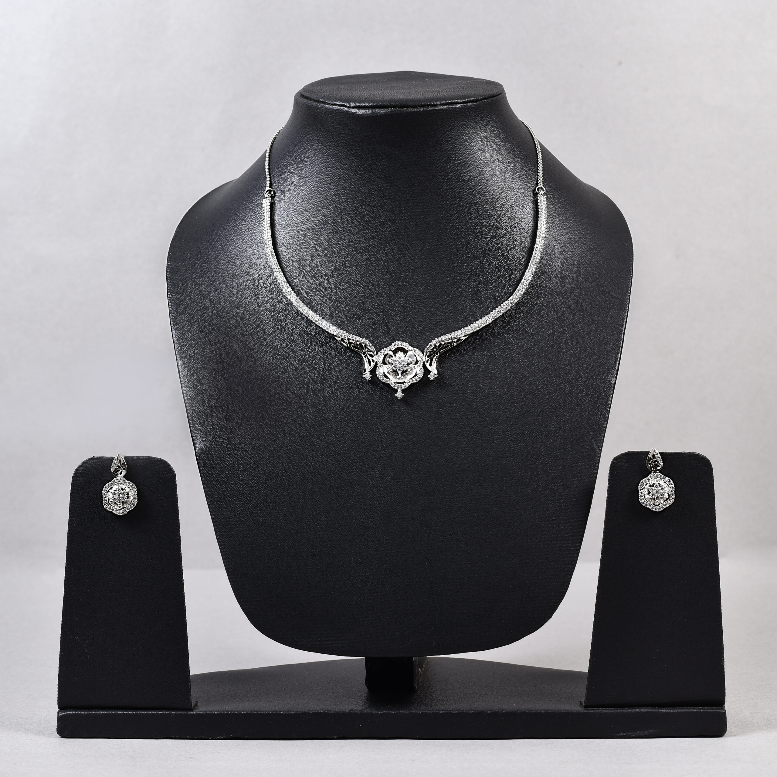 Bring out your graceful side with this American Diamond Floral Charm Necklace Set, offered in both Rose Gold and Silver tones. Featuring a beautifully detailed floral motif at the center, encrusted with sparkling American Diamonds (Cubic Zirconia), this set strikes the perfect balance between minimalism and sophistication. The sleek chain design frames the centerpiece elegantly, while the matching earrings complete the set for a polished look. Perfect for weddings, cocktail parties, or festive occasions, this set adds a subtle yet luxurious sparkle to any outfit.