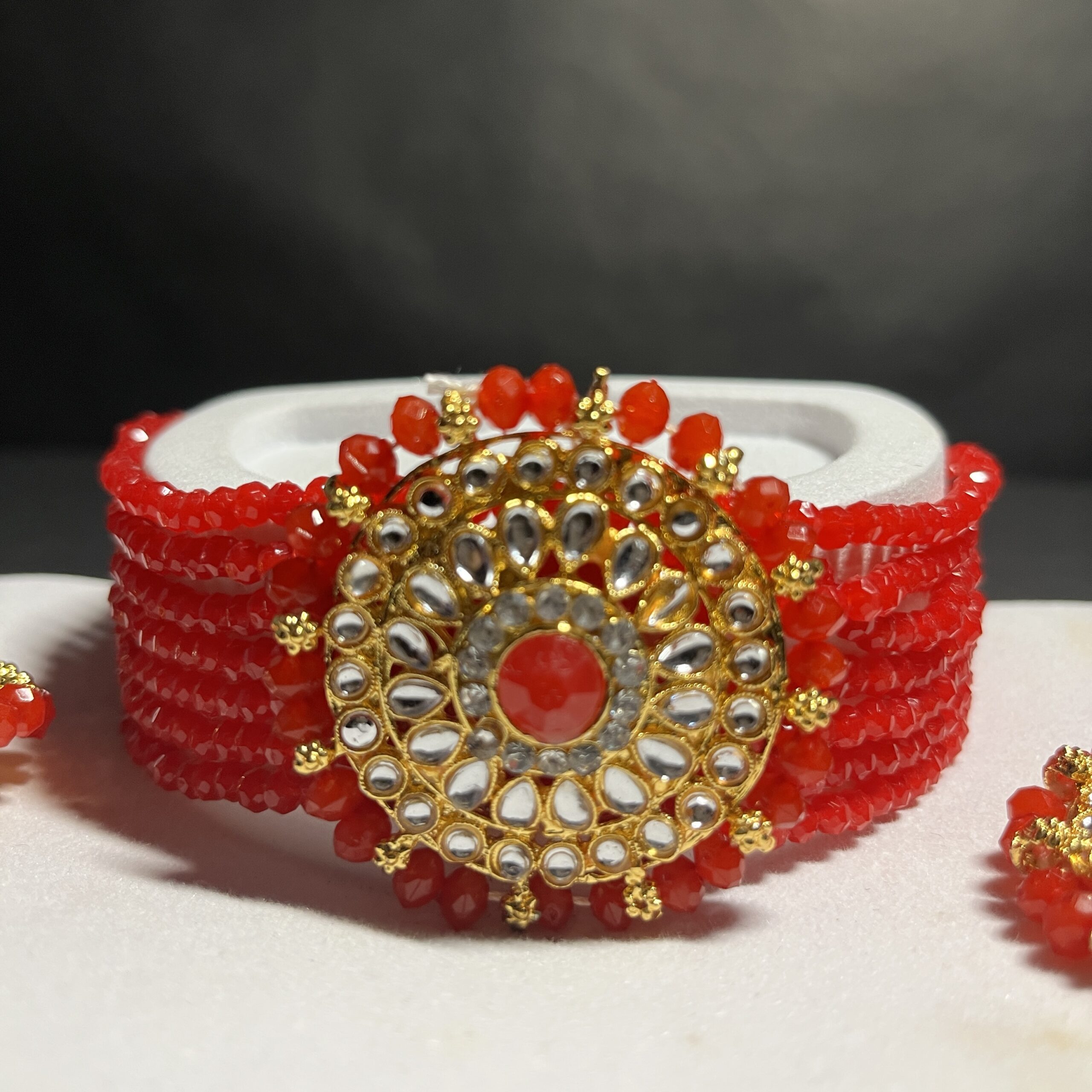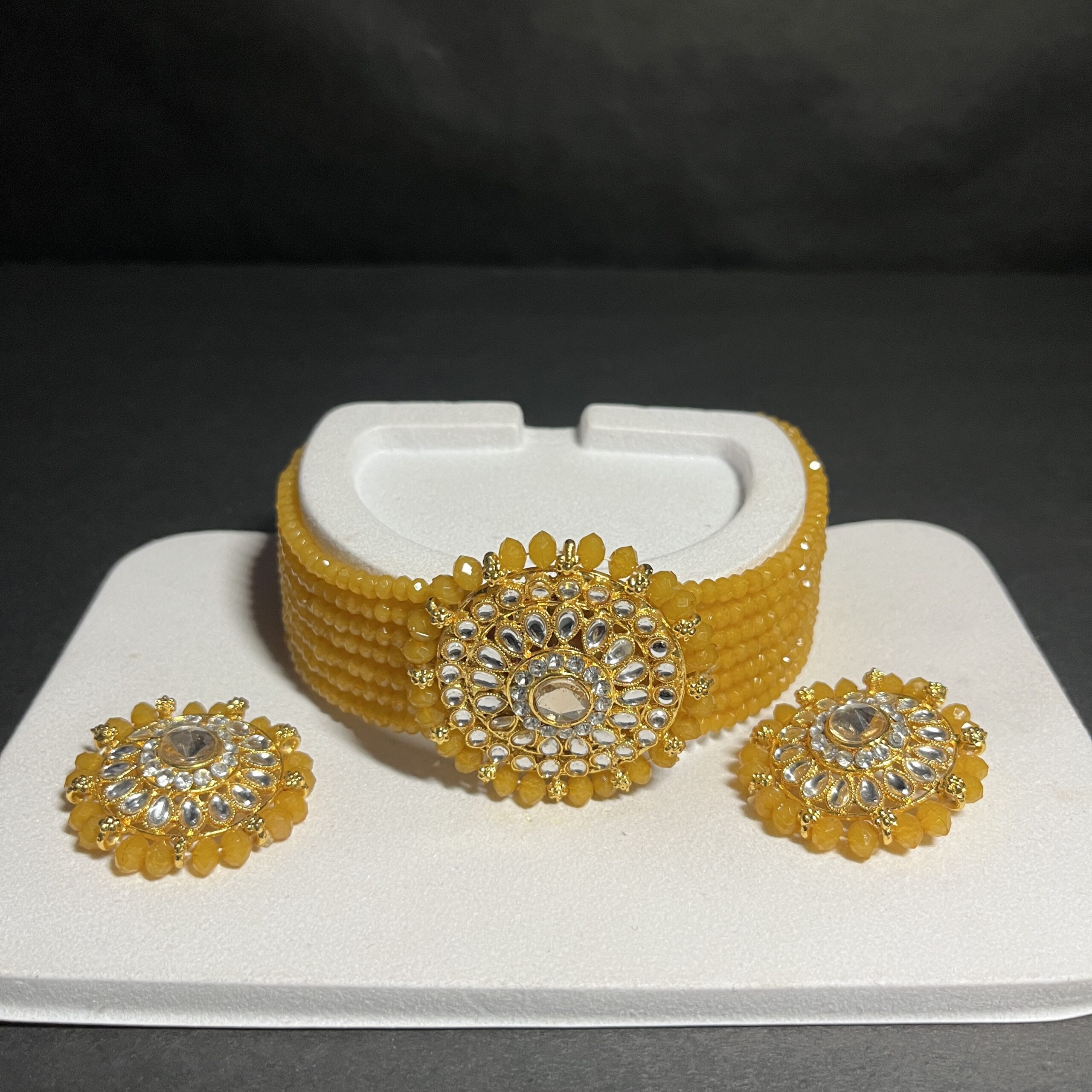 Handcrafted beaded choker set with kundan-style centerpiece and matching earrings. Available in vibrant Mustard and classic Red β€” perfect for haldi, mehendi, festive wear, and traditional occasions.