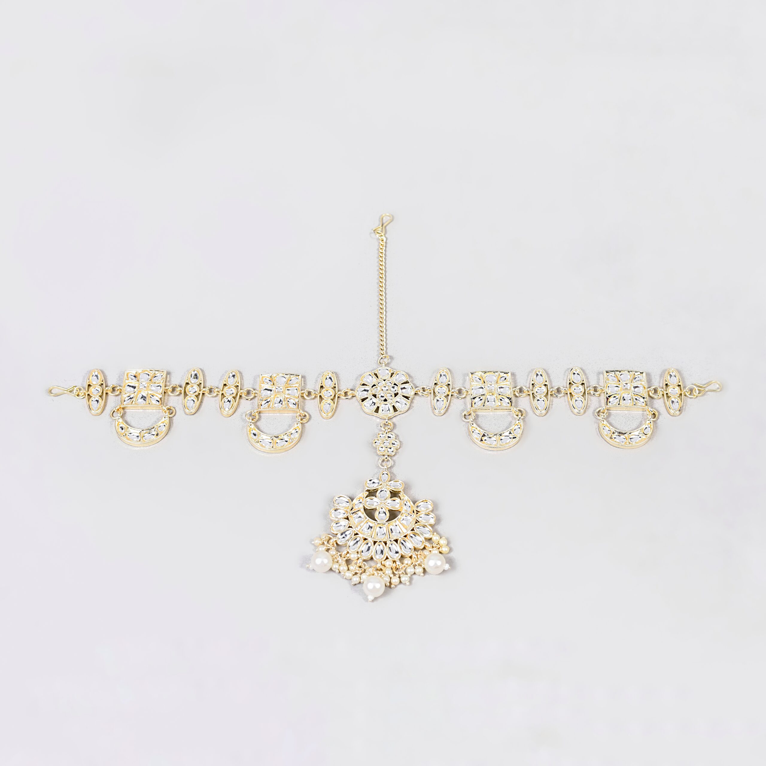 Bring out your inner royal with this graceful kundan-studded mathapatti featuring a central floral tikka and symmetrical side motifs. Adorned with shining kundan stones and finished with a pearl latkan, this piece is ideal for bridal wear, pre-wedding ceremonies, or festive celebrations.